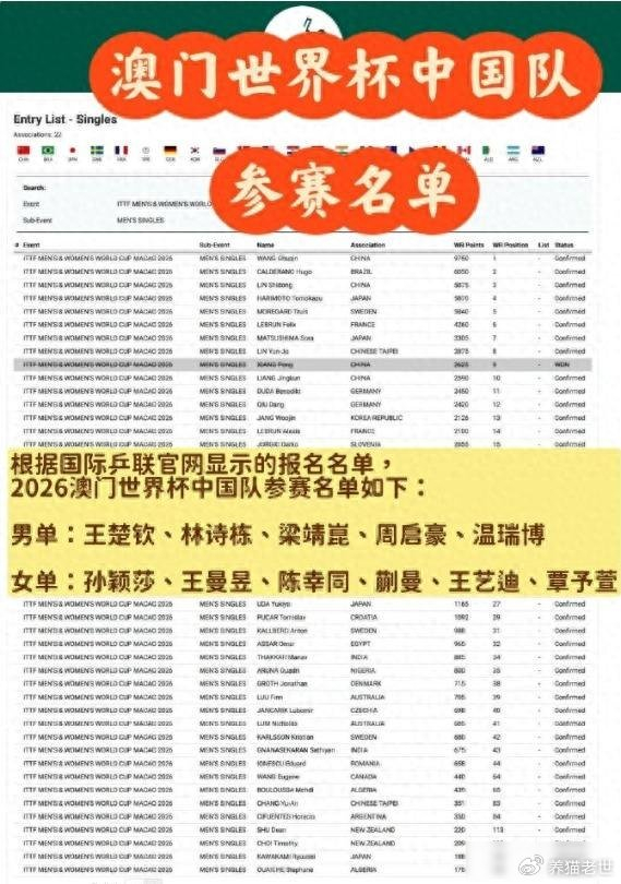 国际乒联公布了2026年澳门世界杯的参赛名单,女单项目有20个名额,中国选手占了6席,但陈熠不在其中,她的世界排名在第8位,按理说应该能入选,可这次确实没进去,原因在于她的积分和成绩没有达到自动入围的标准。